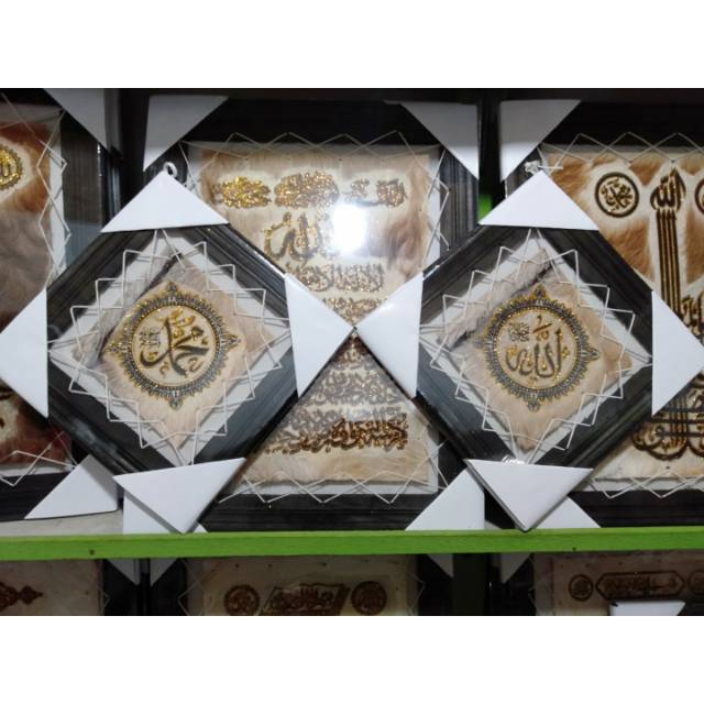 Kaligrafi Allah Muhammad Kulit Kambing Murah dari Jogja 1 sett terdiri dari 2 buah kaligrafi bertuliskan Allah & Muhammad. Ukuran 24cm x 24 cm, Bahan Kulit Kambing dilapisi dengan plastik transparan. Bisa Untuk Hiasan Dinding kamar Tamu Anda, atau digunakan sebagai Souvenir atau hadiah.Bahan dari Kulit Kambing & KayuUkuran 24x24x1.5cmCocok untuk hiasan & souvenirKombinasi warna yang eksotikFoto Asli..! Silahkan klik gambar untuk zoom melihat gambar lebih detail. Corak warna mungkin bisa berbeda, dikarenakan bahan kulit kambing yang tidak bisa sama.Kaligrafi Allah Muhammad ini dibuat dari kulit kambing, yang dilukis dengan menggunakan warna hitam kombinasi emas, memberikan kesan eksotik. Kulit dengan tulisan Allah & Muhammad ini dibingkai dengan kayu yang dicat hitam kecoklat-coklatan, benang putih digunakan untuk mengaitkan kulit pada bin