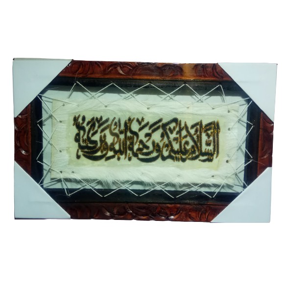 BismillahKami menjual Kaligrafi Kulit Kambing dengan diskripsi produk sebagai berikut:Nama Produk : Kaligrafi AssalamualaikumUkuran : 20cm X 40cm X 3cmBahan Bingkai : KayuBerat : 500 gramWarna Kulit Tidak Sama Karena Menyesuaikan dengan warna kulit