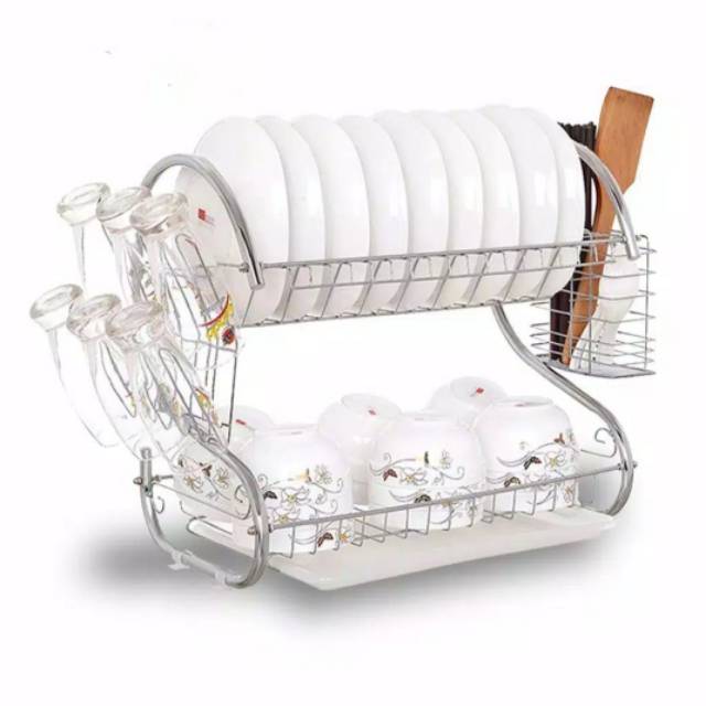 Tentunya Anda ingin piring dan gelas yang habis dicuci cepat kering agar bisa cepat dipakai kembali. Rak piring dan tempat gelas dapat menjadi tempat pengeringan peralatan makan yang alami, dan juga tempat menata peralatan makan yang sudah kering.Dengan model yang minimalis dan design yang menarik akan membuat dapur Anda tampak lebih cantikBisa ditaruh di atas meja atau kitchen set dekat wastafel dapur bersih Andaukuran : 40 x 25 x 38 cm- Rak pengering Piring- Rak dilapisi dengan stainless steel krom- Dilengkapi tempat menampung air piring basah sehingga lantai tetap kering- Dilengkapi tempat gantung Gelas dan tempat Sendok Garpu- muat 16 pi