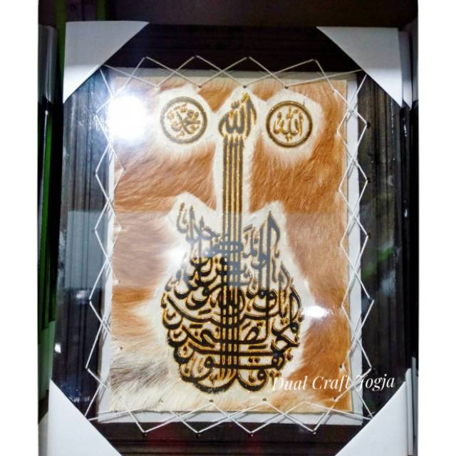 Kaligrafi dengan ukuran bingkai ukuran 44x33 cm, Bahan Kulit Kambing dilapisi dengan plastik transparan. Bisa Untuk Hiasan Dinding kamar Tamu Anda, atau digunakan sebagai Souvenir atau hadiah.Kaligrafi ini dibuat dari kulit kambing, tulisan menggunakan warna hitam kombinasi emas, memberikan kesan eksotik. Kulit dengan tulisan Arab ini dibingkai dengan kayu yang dicat hitam kecoklat-coklatan, benang putih digunakan untuk mengaitkan kulit pada bingkai.Pengiriman dilapisi koran dan dus tebal agar