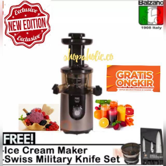 ##Free Ongkir Pulau Jawa##KEUNGGULAN DAN FUNGSI PRODUK :Sistem peras/cold press atau dengan metode tanpa menghancurkan/mencincang bahan makanan sehingga meminimalkan kerusakan bahan makananMenjaga nutrisi dan rasa, buah dan sayur tetap terjagaMultiple extraction: dapat membuat jus campur dalam satu proses mix juice buah dan sayurMultiple function: dilengkapi dengan Ice cream makerDengan “Low Speed Masticating” hanya 50-60 Rpm: memeras dengan kecepatan peras 50-60 putaran per menit, berbeda dengan juicer yang menggunakan mata pisau besi dengan perputaran cepat, sehingga dapat mengakibatkan oksidasi/kerusakan bahan makanan lebih cepat.Hemat listrik, hanya dengan 180 wattDilengkapi dengan 2 smart cap pada jus outlet dan pulp outlet SPESIFIKASI PRODUK :Material : Plastic & Stainless SteelPower : 220-240V,50-60HzDaya Listrik : 180 wattKecepatan : 50-60 RPMWaktu Kerja : 20 MenitWarna : MerahGransi 1 Tahun ISI PAKETAN :1 main unit Balzano Slow JuicerLubang BuahWadah Penampung JusWadah JusWadah Es KrimSaringan JusSaringan Es KrimKatup Lubang JusKatup Lubang AmpasPemutar KaretPendorong BuahUlir PemerasSikat PembersihBuku Resep BONUS :Swiss Military Knife Set PERINGATAN DAN PERHATIAN :Pasang wadah dengan ultem/alat peras dan penyaringnya hingga berbunyi klikPasang penutupnya hingga berbunyi klik jugaLetakkan wadah ampas dan wadah sari buah sesuai dengan salurannyaNyalakan alat dan proses jus, jika kesulitan memasukan buah, gunakan fungsi pendorongPenggunaan ice cream maker sama dengan jus, ganti dengan saringan ice cream maker. Gunakan buah yang dapat dipotong dengan tangan untuk hasil maksi