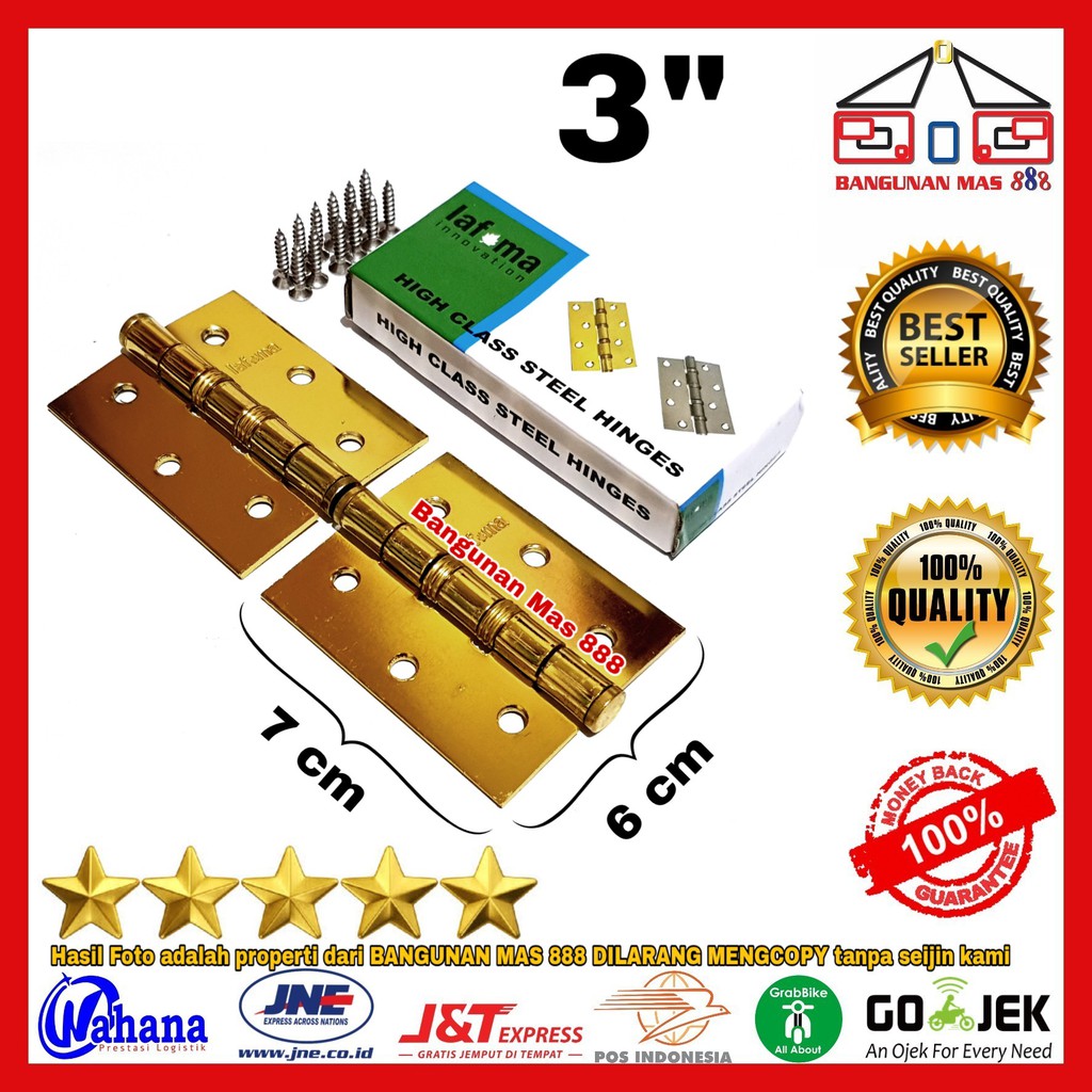 "Engsel merk LAFUMA warna KUNING1. Bahan tebal dan bagus 2. Harga diatas harga perpasang dan sudah termasuk sekrup 3. Finising rapi 4. Chrouman bagus 5. Tidak mudah bercak atau berkarat 6. ring presisi tidak oblak(goyang2) 7. Cocok buat semua jendela atau pintuLapak kami tersedia 3 ukuran 3in untuk jendela 4in untuk pintu 5in untuk