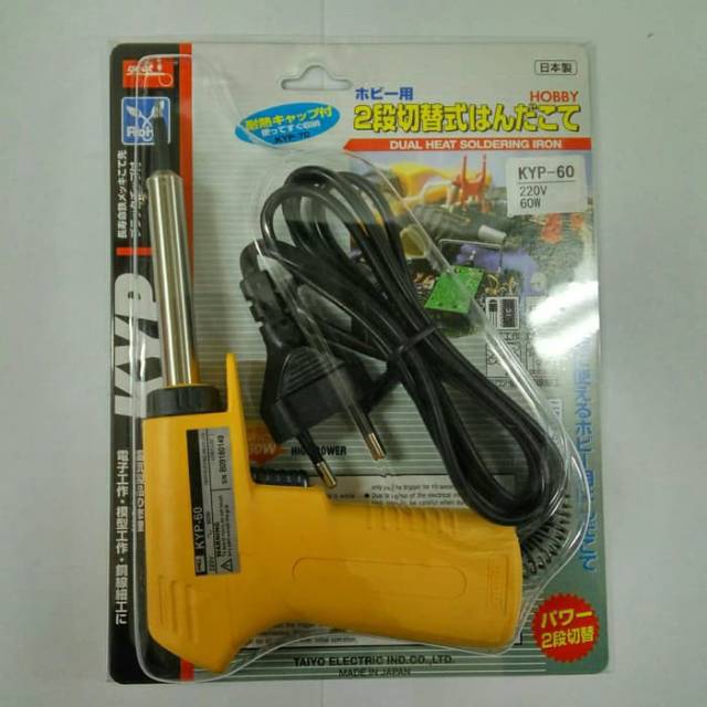 Solder Goot KYP 60 30-60W ORIGINAL JAPAN Voltage :220V AC 50/60HzPower Consumption : Trigger ON 60W/Trigger OFF 30WHeater : Nichrome HeaterLength : 170mmWeight : 160gTrigger pada gagang jika di tekan : Panas pada ujung solder akan meningkat ke arus power 60watt. Trigger pada gagang jika di dilepas/tidak di tekan : Heater akan kembali ke power 30watt (Panas menurun perlahan ke mode standby).NOTE : Trigger tidak boleh terlalu lama di tekan pada saat proses solder (untuk mencegah elemen overheat/putus). Baca petunjuk pemakaian pada kemasan atau browsing di google mengenai cara pemakaian yang b